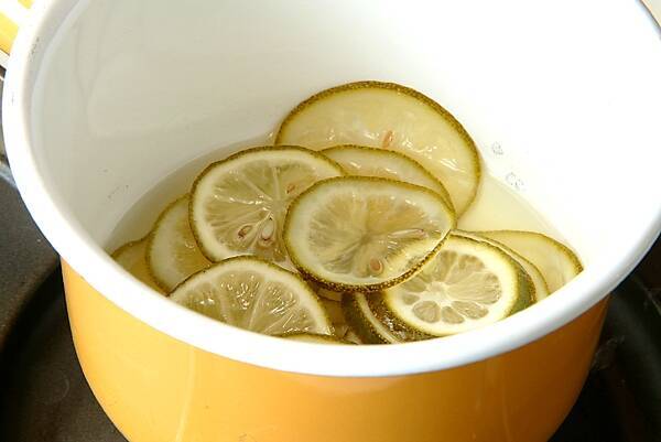 <レモンシロップ>を作る。レモンはきれいに水洗いし水気を拭き取り、輪切りにする。輪切りのレモンと砂糖をステンレスまたはホーロウの小鍋に入れ、中火にかけ砂糖が溶ければ少し煮詰めて冷ましておく。(水分が少ないようなら水大2~3を加えて下さい)