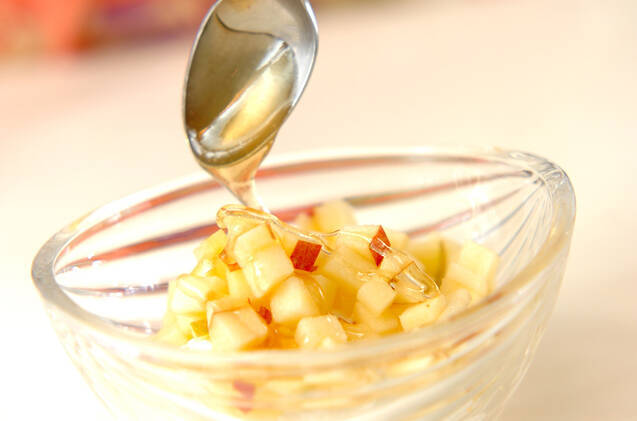 器に水きりしたプレーンヨーグルトを入れ、リンゴをのせる。全体にハチミツをかけ、ミントを飾る。
