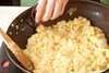 ショウガ、白ネギを加えて全体に炒めあわせ塩コショウで味を整える。最後に鍋肌からしょうゆを加えて全体をなじませ、サヤインゲンを加えて混ぜあわせ、器に盛り付ける。
