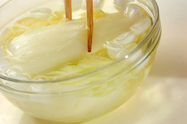 鍋にたっぷりの湯を沸かして塩を入れ、白菜の軸を入れる。透き通ってきたら葉を加え、再び沸騰したら冷水に放つ。