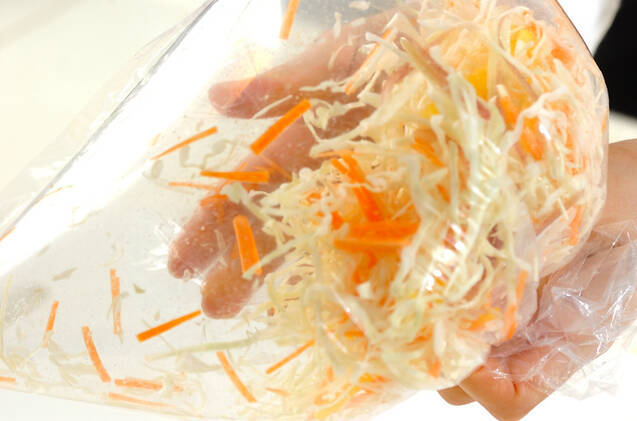 ビニール袋に野菜と塩を入れ、袋に空気を入れて袋の口をしっかり持ち、袋を振って全体に塩をからめる。袋の空気を出来るだけ抜いて袋の口を縛り、水気が出てくるまでそのまま置く。