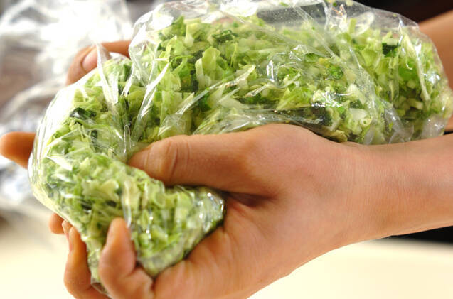 菜の花は軸のかたい部分を切り落とし、分量外の塩少々を入れた熱湯で1分ゆでてザルに上げ、水気をきる。セロリはピーラーで筋を取り除く。全ての野菜をみじん切りにする。大葉以外の野菜と塩をビニール袋に入れてもみ、水気がでてしんなりしたら、しっかり絞る。