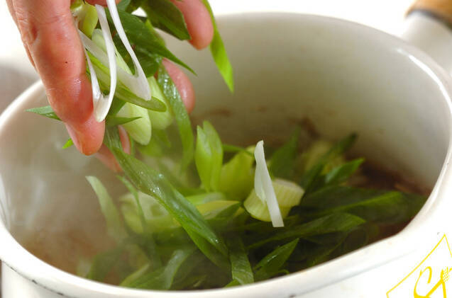 再び煮たったら中火にし、玉ネギが少し透き通るまでアクを取りながら5~6分煮、青ネギを加える。