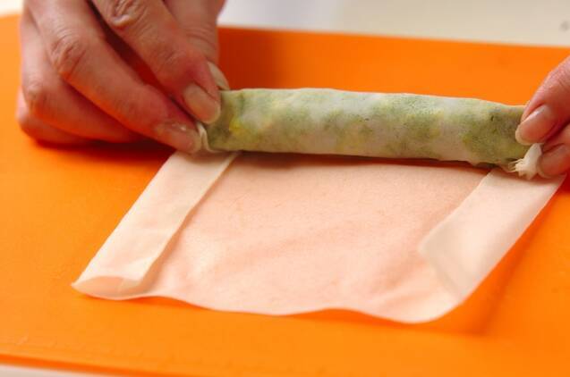 アボカド1/4量を春巻きの皮に細長くのせてひと巻きし、左右を内側へ折り、さらに巻いて巻き終わりを<小麦粉のり>で留める。全部で4本作る。