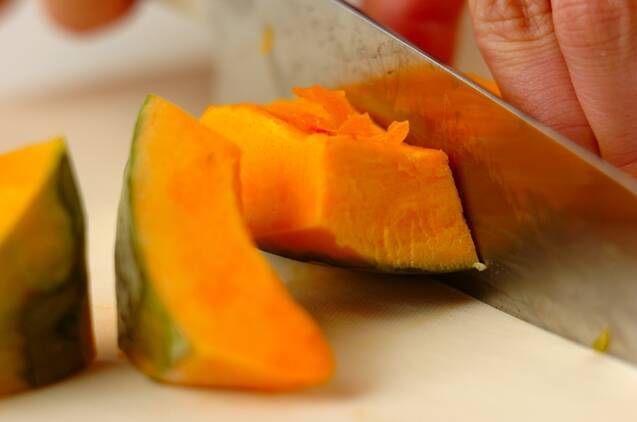 カボチャは種とワタを取り除き、皮のかたい部分を削ぎ落とし、大きめのひとくち大に切る。