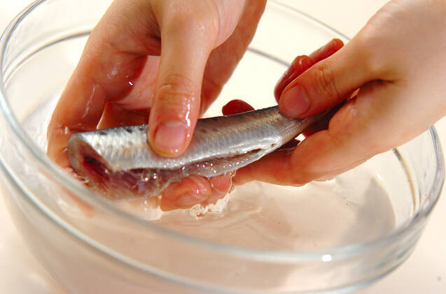 イワシは頭と尾を切り落とし、ワタを出して塩水で洗い、水気をきる。