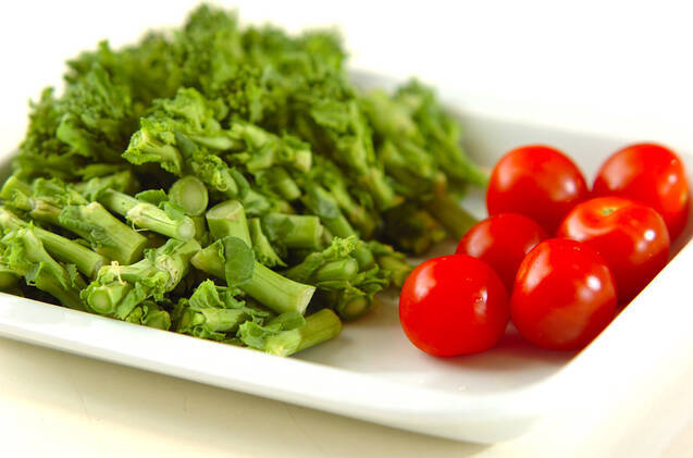 菜の花は根元1cmを切り落とし、長さを半分に切る。