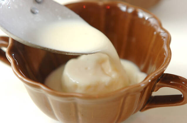 スープカップに(2)の<ホタテのフラン>を入れ、上から(4)の<ポタージュ>を注ぎ入れる。