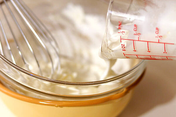 ボウルに生クリーム、グラニュー糖を入れ、泡立て器で良く混ぜ合わせる。プレーンヨーグルト、ラム酒を加え、ざっくり混ぜ合わせる。