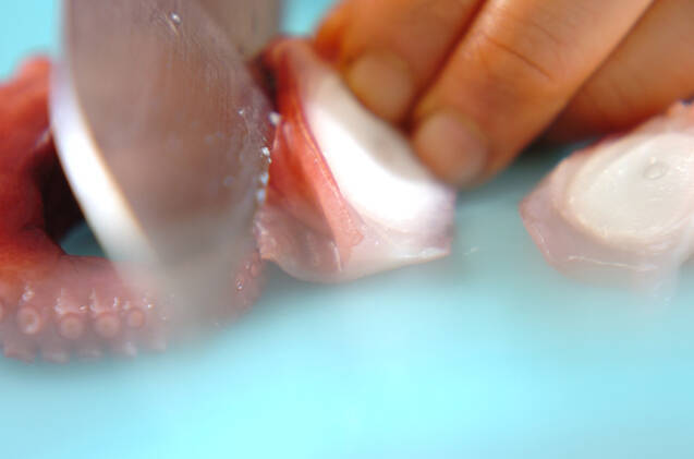 ゆでタコ足は分量外の塩水で洗い、斜め薄切りにする。