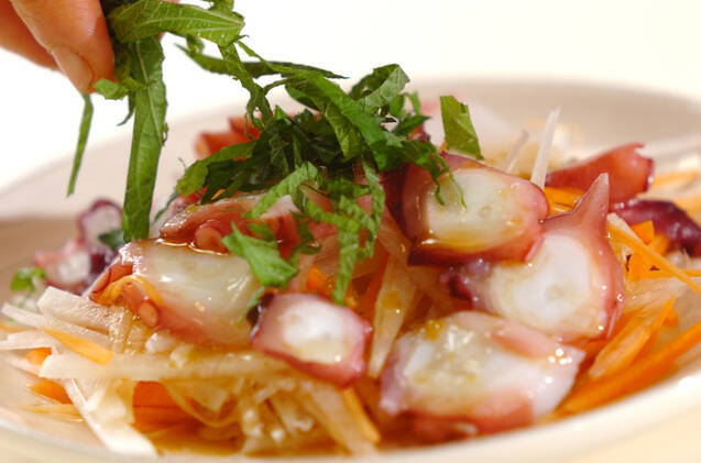 器にゆでタコ足、大根、ニンジンを盛り合わせ、<ドレッシング>をかけて大葉を散らす。