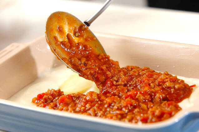 耐熱容器に分量外のバターをぬり、<ホワイトソース>半量を広げ、ジャガイモを1/3量並べる。その上に、<ミートソース>半量、ジャガイモ1/3量、残りの<ホワイトソース>、残りのジャガイモ、残りの<ミートソース>と重ねる。