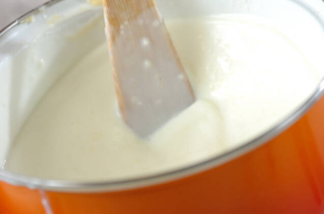 <ホワイトソース>を作る。鍋にバター40gを弱めの中火で溶かし、小麦粉を加えて粉っぽさがなくなるまで木ベラでよく混ぜる。フツフツと泡が出てきたら牛乳を一気に加え、泡立て器でダマが出来ないようによく混ぜ合わせ、トロミが付いてきたら、顆粒スープの素、塩コショウ、ナツメグを加え、木ベラで混ぜる。