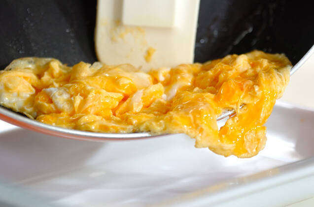 フライパンにサラダ油小さじ2を強火で熱し、卵を一気に流し入れ、菜ばしで大きく円を描くように混ぜ、半熟状態でいったん取り出しておく。
