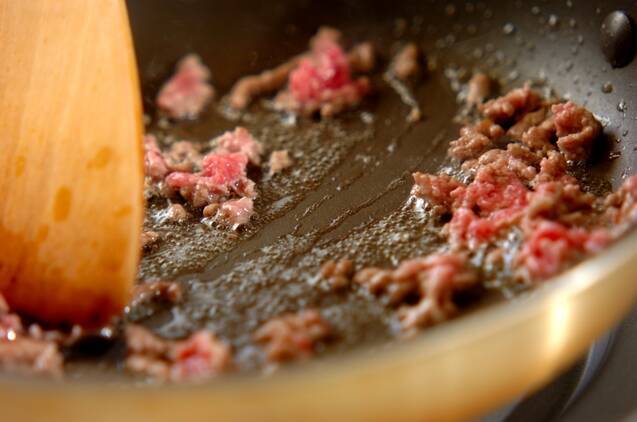具材を炒める。フライパンにサラダ油を熱し、豚ひき肉を炒める。