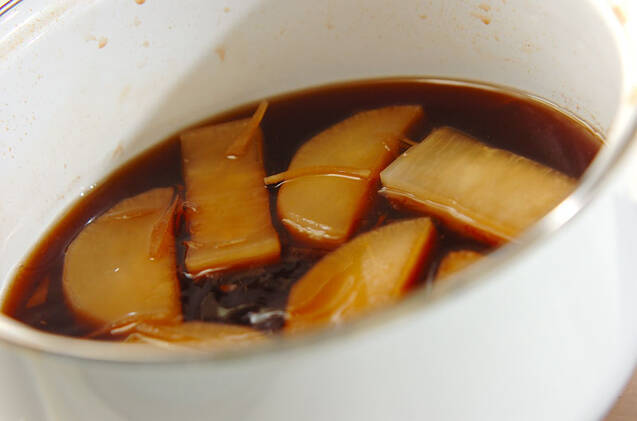 鍋に大根を汁ごと加え、大根がヒタヒタにつかる位までだし汁を加え、落とし蓋をして強火にかける。煮たったら火を弱めて15分煮る(竹串がス~ッと大根に刺さったらOKです)。