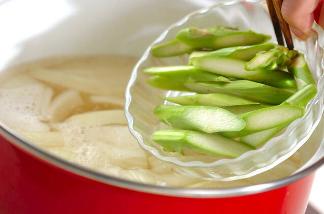 鍋にだし汁、玉ネギを入れて中火にかけ、煮立ったら油揚げ、グリーンアスパラを加えて2~3分煮る。