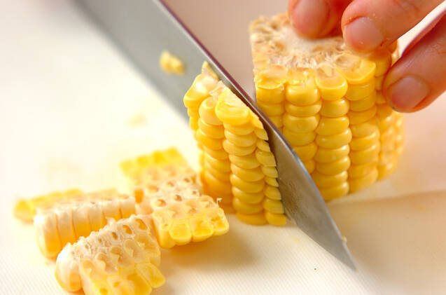 トウモロコシは長さを半分に切り、包丁で実を削ぎ落とす。塩を入れた熱湯に入れ、再び煮たったら1~2分ゆで、ザルに上げる。