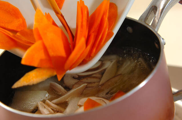 (1)が煮たったらアクを取り、冬瓜をゆで汁をきって加え、再び煮たったらシイタケ、ニンジンを加える。
