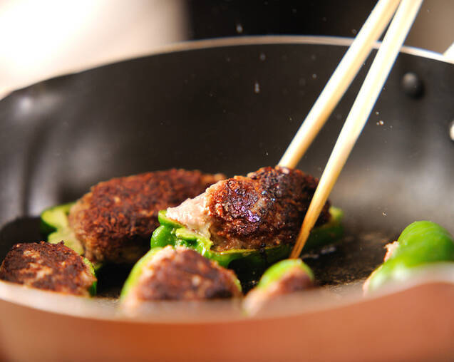 フライパンにサラダ油を中火で熱し、肉側を下にして並べ入れる。焼き色がついたらひっくり返す。