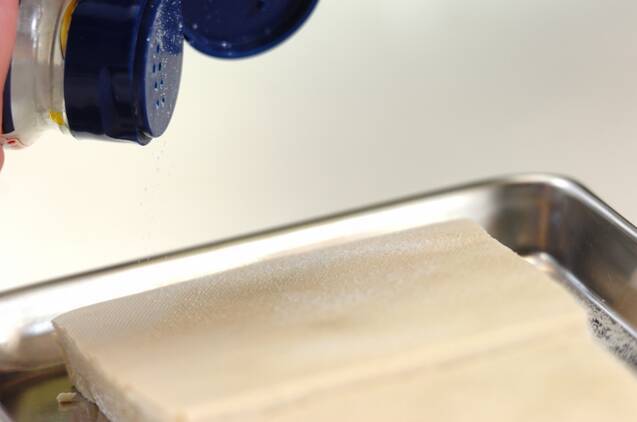 木綿豆腐は厚さ半分に切り、キッチンペーパーで包んで水気をしっかりきり、塩少々を振る。玉ネギは縦薄切りにする。