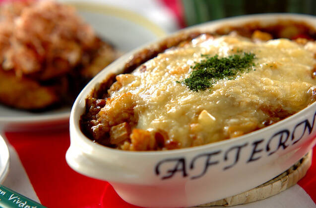 納豆、牛肉、ジャガイモ、ニンジン、玉ネギが入った具だくさんのカレードリアです。納豆が隠し味のようで、苦手な方も十分食べられます。