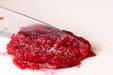 <合わせ梅肉>の梅干しは種を取り出し、包丁でペースト状になるまで梅肉を叩いてボウルに入れ、他の材料を加えて混ぜ合わせる。