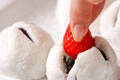 生地で2のこしあんを包み、形を整える。片栗粉をつけながら包めば手にくっつきにくいです。形が整ったら上部分にはさみで十字に切り込みを入れ、切り込みを少し開いてイチゴをのせる。