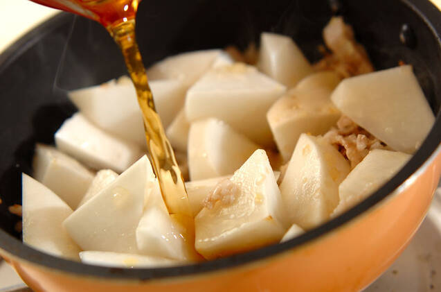 豚肉の色が変わったら、大根を加えて炒め合わせる。油がまわったら<合わせだし>の材料を加え、強火にする。