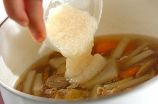 (1)にだし汁を加え、野菜に火が通るまで中火で煮る。途中、アクを取り、塩麹を加え、1~2分ほど煮る。器に注ぎ、ネギをのせる。