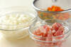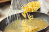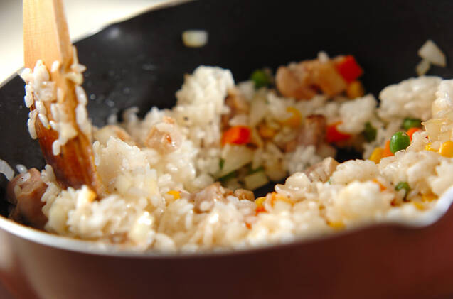 フライパンにバターを入れて中火にかけ、鶏もも肉の色が白っぽくなるまで炒め、さらに玉ネギ、ミックスベジタブルを入れてしっかり炒め合わせ、塩コショウを振る。ご飯を加えてよく混ぜ合わせ、さらに<調味料>の材料も加えてよく混ぜ合わせる。