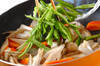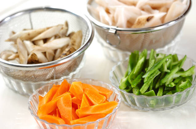 ゴボウはたわしで水洗いしてニンジンくらいの大きさに切って水に放ち、ザルに上げしっかり水気を切る。