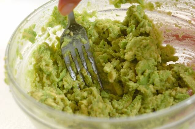 アボカドは実を取り出してフォークで粗くつぶす。<小麦粉のり>の材料を練り混ぜる。揚げ油を170℃に予熱し始める。