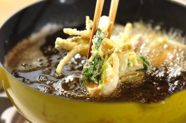 (2)を170℃の揚げ油にひとくち大ずつまとめるように落とし、カリッと揚げる。器に盛り、レモン、塩を添える。