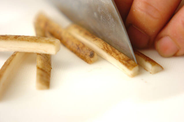 ゴボウはタワシできれいに水洗いし、長さ3cmの太めのせん切りにし、水に放つ。
