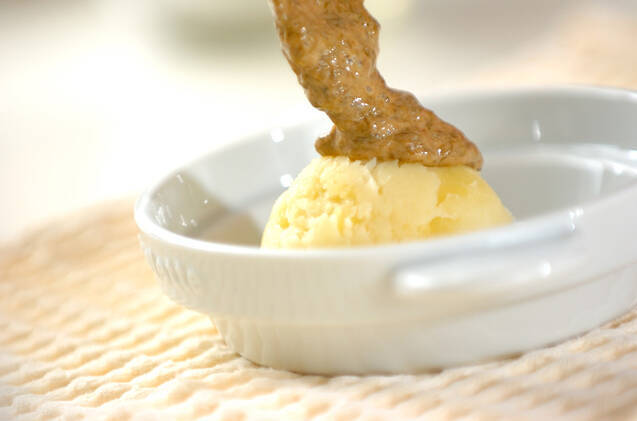 マッシュしたジャガイモにバターを加えて混ぜ合わせ、器に盛り、<佃煮マヨダレ>をかけて大葉をのせる。