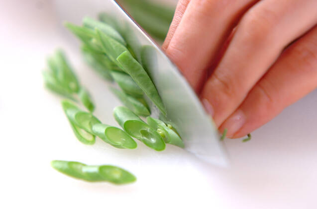 インゲンは軸側を少し切り落として、ゆでる塩を入れた熱湯でゆでて水に取り、粗熱が取れたら斜め切りにする。