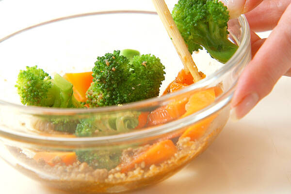 <ゴマダレ>を合わせてブロッコリー、ニンジンと混ぜ合わせる。