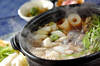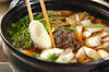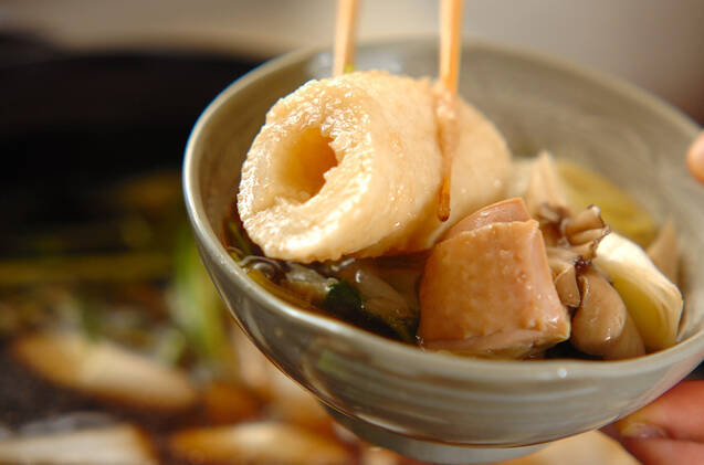 取り鉢に煮えた具と煮汁を取り、お好みで柑橘汁、一味唐辛子を振っていただく。きりたんぽは早くから入れると、煮崩れてしまいますので、注意して下さい。