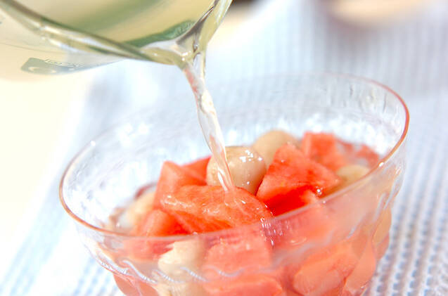 器にスイカ、(3)の白玉団子を盛り合わせ、<シロップ>を注いでミントの葉を飾る。