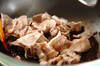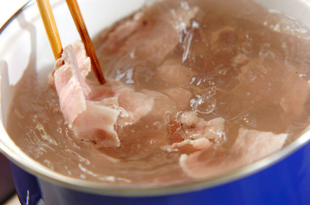 豚バラ肉は長さ4~5cmに切り、熱湯に通してサッとゆで、ザルに上げる。