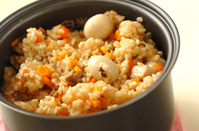 炊飯器にお米、(2)を入れ、豚バラ肉、ニンジン、シイタケ、水煮タケノコ、ウズラの卵をのせスイッチを入れる。炊き上がったら10分程蒸らし、混ぜ合わせる。