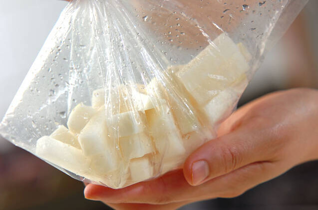 大根は皮をむき、1cm角の棒状に切り、抗菌のビニール袋に塩と共に入れる。袋に空気を入れて振りながら全体に塩をからませ、袋の空気を抜いて口をしばっておく。