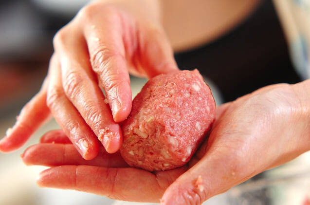 ボウルに<タネ>の材料、みじん切りにしたキャベツの軸を加える。よく混ぜ合わせてキャベツの枚数に合わせて分け、俵型にする。