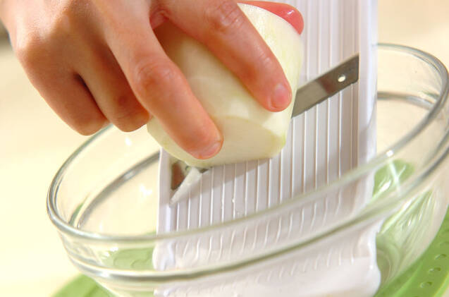 大根は皮をむいて縦半分に切り、繊維の方向(縦)に薄くスライスし、冷水に放ってパリッとしたら水気をきる。