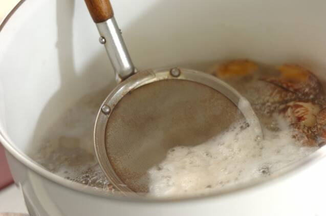 鍋にアサリ、昆布、酒、水を入れて中火にかける。煮たったら昆布を取り出し、貝が開いたらアクを取る。