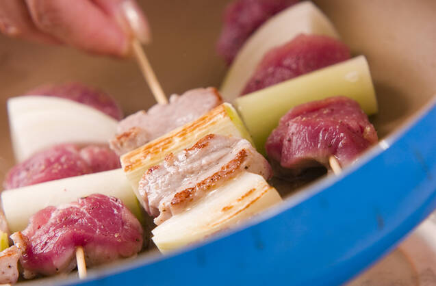 フライパンにサラダ油を薄く敷き、2の串を並べて両面焼き色がつくまで中火で焼き、火を弱め蓋をして豚肉にしっかり火を通す。