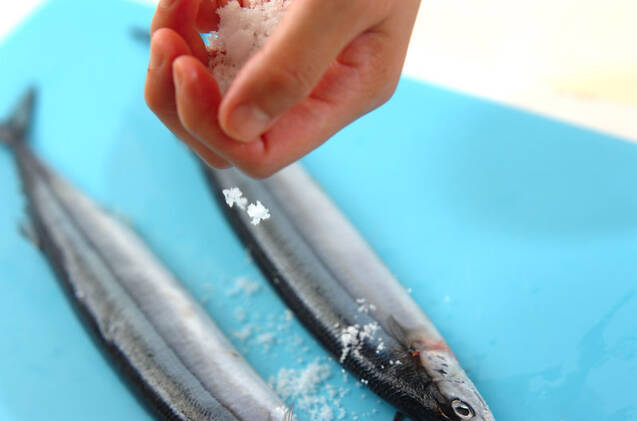 サンマは水洗いして水気を拭き取る。振り塩をして10分以上置いて身をしめ、出てきた余分な水分を拭き取る(振り塩は手に塩を持ち、並べた魚の20~30cm位上から指の間を通して均等に塩を振ることです。身の厚い部分には少し多めに振って下さい)。