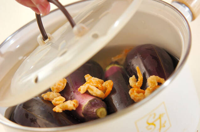 鍋に水気をきったナスを並べ、干しエビ、干しエビのもどし汁、だし汁、<調味料1>の材料を加え、落とし蓋をして強火にかける。