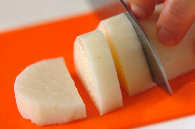 長芋は皮をむき幅1cmの半月切りにする。ニンニクは包丁の腹でつぶす。